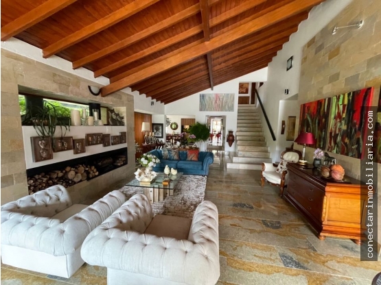con 317 metros construidos y 12.000 metros de lote. Biblioteca o estudio Baño social 3 habitaciones en el primer piso con closet y baño cada una Cuarto de servicio Sala Comedor Hall Terraza Closet de linos Cuarto útil Alcoba principal con baño y vestier Casa mayordomo Cancha de fútbol Jardines Árboles frutales Agua propia
